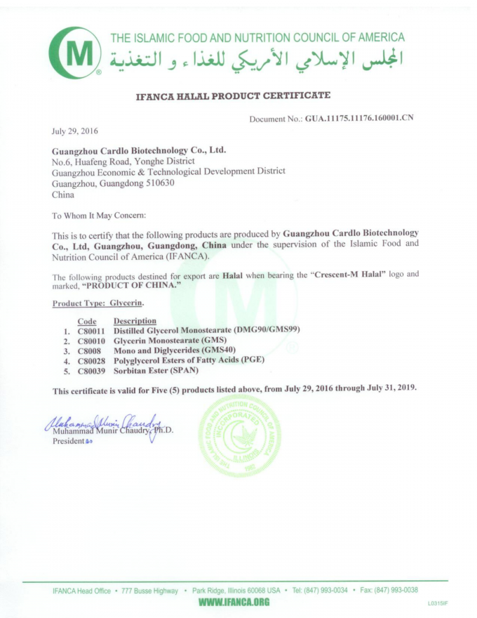 글리세롤 모노라우레이트는 요즈음 진보적 식품 유화제 방부제이고 자연스럽게 모유에 존재하고 그것이 국제적으로 좋은 식품 유화제로 인식됩니다. 한편, 그것은 안전한 효과적, 광역 스펙트럼 항 미생물제입니다. 그것의 LD50> 10g/kg, 논-톡식 식품이 첨가물입니까. 2005년 4월에, GML이 이제 될 수 있으므론 승인받은 중국 보건부가 음식의 모든 종류와 어떤 복용량 한계에 사용하지는 않았다고, 그것은 실제 필요에 따라 추가될 수 있습니다.
